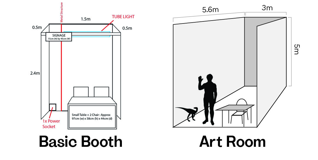 | Basic Booth | Solo Artists | 1.2m (W) x 2.4m (H) | 0.97m (W) x 0.44m (L) x 0.58m (H) | MYR 700 + RM600 (Deposit) |